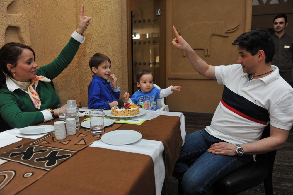 Természetesen a szülinapos köszöntése sem maradhatott el. Volt afrikai torta, gyertya, zene és szurikáta is. Bizsu, a szálloda kabala szurikátája egy tortával érkezett az ebédhez. A kis Adrián kikerekedett szemekkel figyelte. A gyertyát a szülőkkel közösen fújták el.